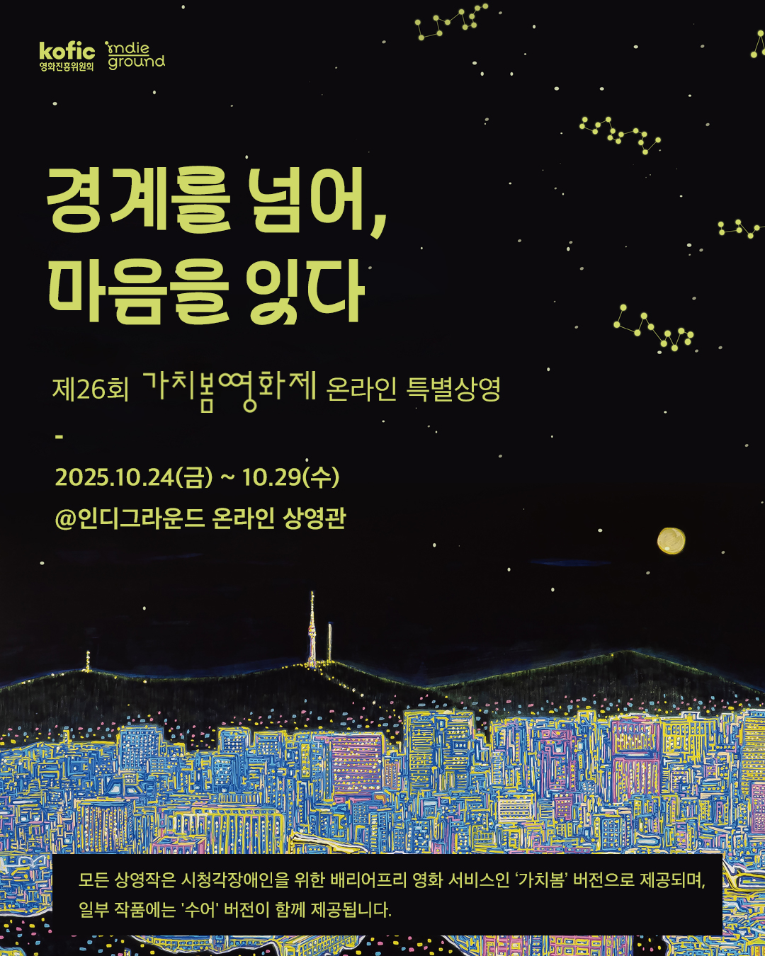 국내에서 가장 오래된 경쟁 장애인 영화제인 제26회 가치봄영화제(주최:영화진흥위원회, 주관:한국농아인협회, 한국시각장애인연합회)의 뜨거웠던 감동과 여운을 인디그라운드 온라인 상영관에서 만나보세요. 가치봄영화제의 주요 수상작과 프로그래머 추천작이 인디그라운드 온라인 상영관에서 '가치봄 버전'(배리어프리 버전)으로 상영됩니다. 다양한 시선이 담긴 이 이야기들을 통해, 그들이 '그곳에 있었음'을 기억하고, '여기에 함께 있음'을 다시 한번 확인하며 보이지 않는 연대감과 사랑을 느낄 수 있길 바랍니다💖 |